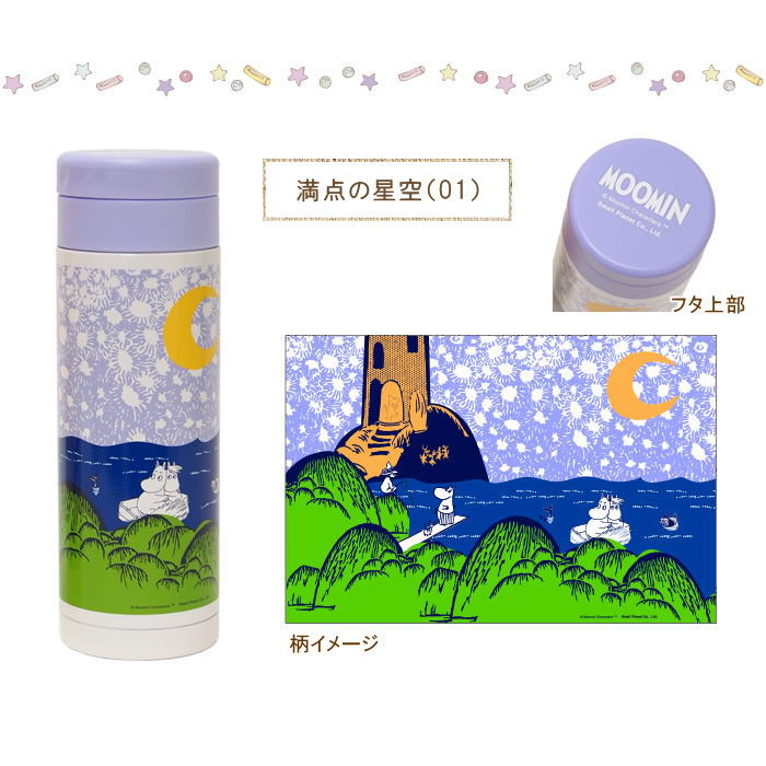 直飲みタイプの保温&保冷ステンレスボトル ・Spec 商品名 ムーミン ステンレスボトル 素材 本体:ステンレス鋼 フタ・飲み口:ポリプロピレン パッキン:シリコンゴム サイズ φ約6.5cm×h約19.5cm 内容量:350ml 重さ:約210g 備考 保温効力(スタート95度):55度以上(6時間) 保冷効力(スタート2度):10度以下(6時間) ※内容量や使用状況などにより異なりますので、あくまでも目安としてお考えください。